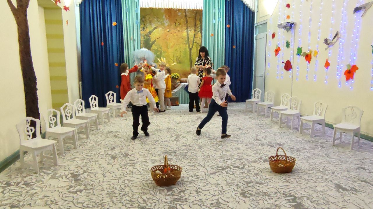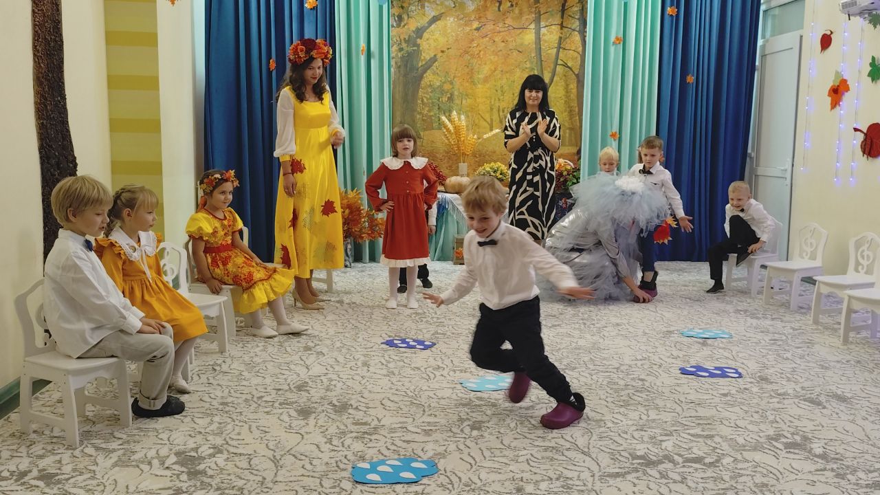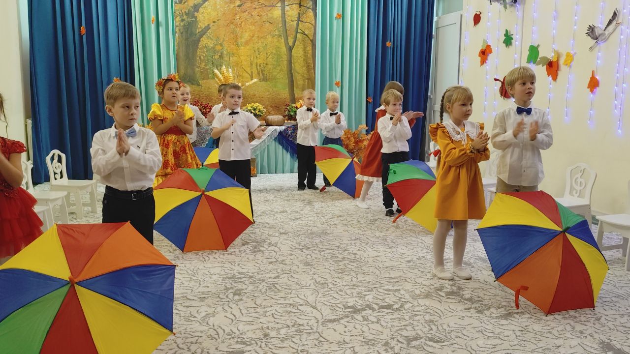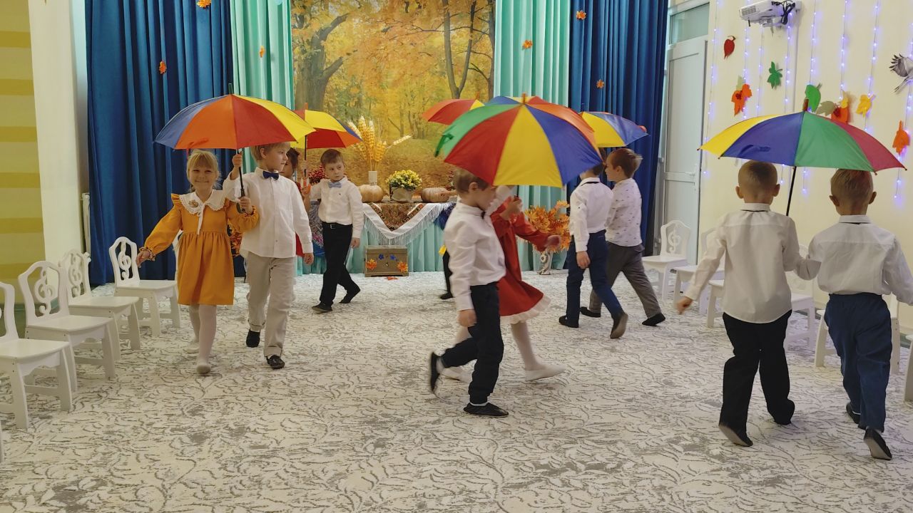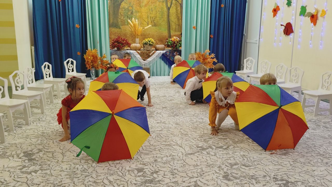 Дети веселили тётушку Непогодушку песнями, танцами и играми. Ребята собрали весь урожай овощей и грибы на лесной поляне, перепрыгнули все лужи и исполнили танец «Под зонтами».