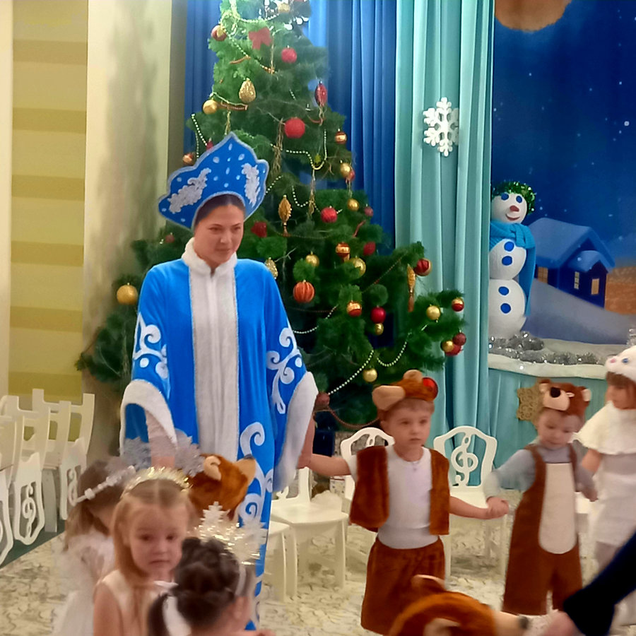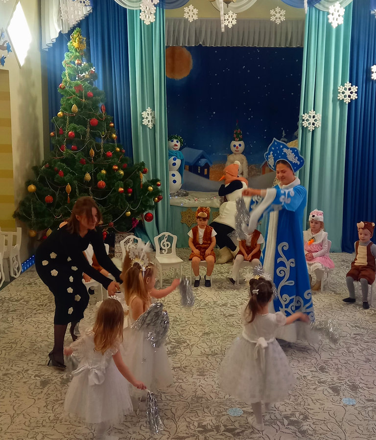 Снегурочка, снежинки, зайцы и медвежата пытались разбудить Снеговика, но только с приходом Деда Мороза Снеговик проснулся и присоединился к праздничному мероприятию.
