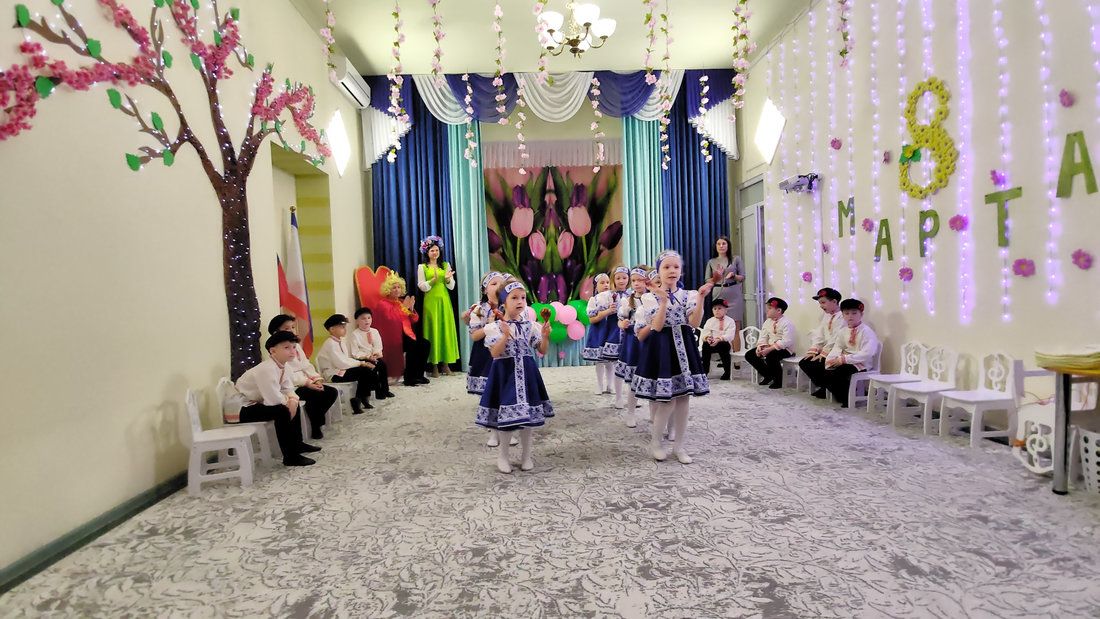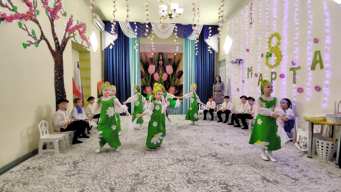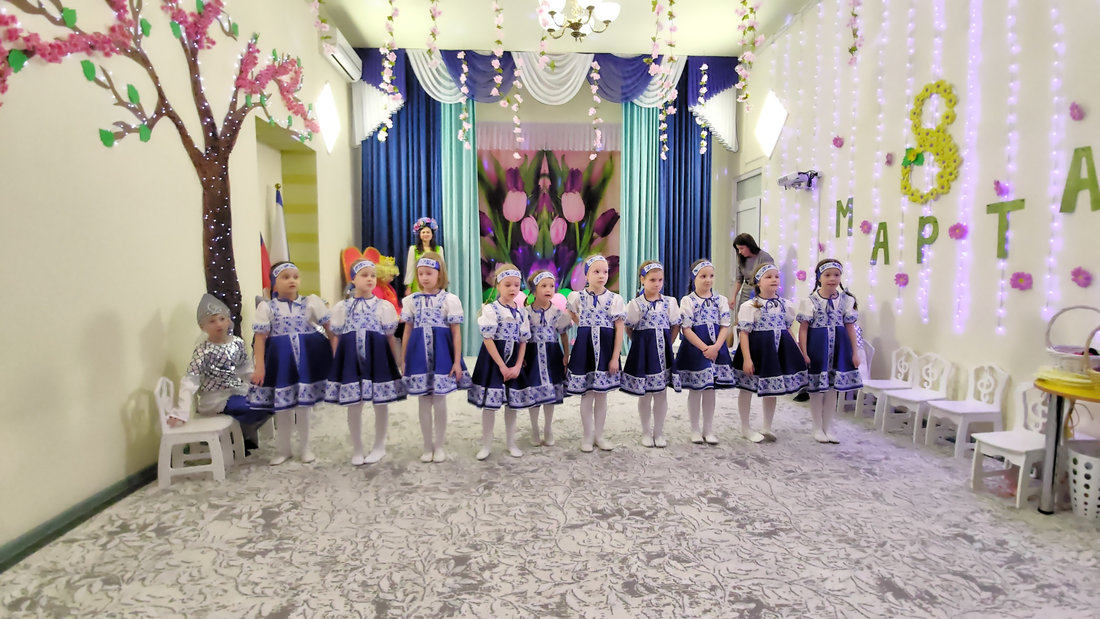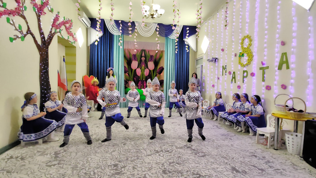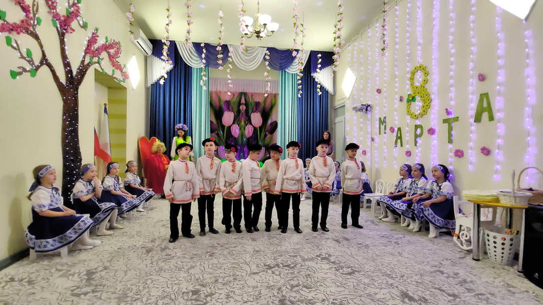 В эту пятницу воспитанники подготовительной группы «Светлячки» порадовали своих мам и бабушек настоящей весенней сказкой. Царь Горох побывал на мероприятии в поисках невесты для своего сына, но так и не смог отдать предпочтение одной из них. Смелые и отважные мальчики в образе русских богатырей танцевали для девочек, читали стихи и помогали в хозяйственных делах.
