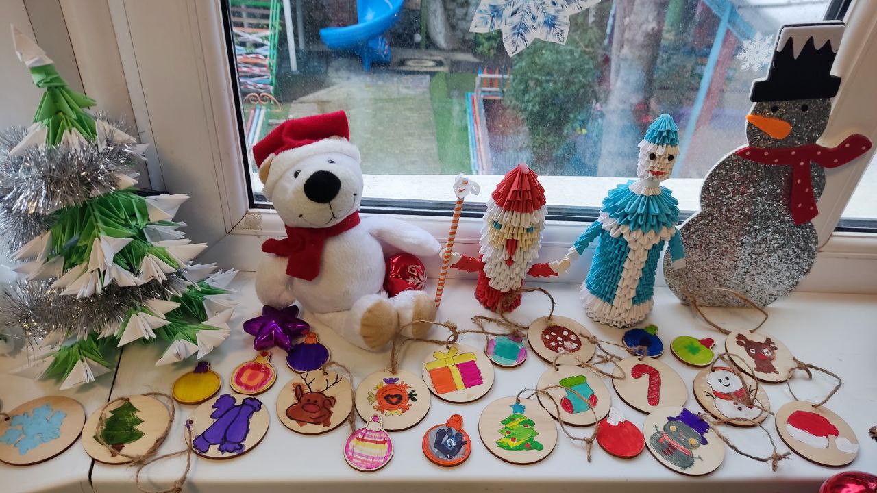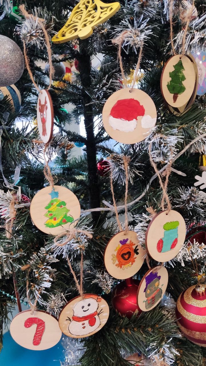 Дети с интересом занялись творчеством и с большим удовольствием расписали новогодние игрушки. А затем украсили ёлочку в группе своими творениями.