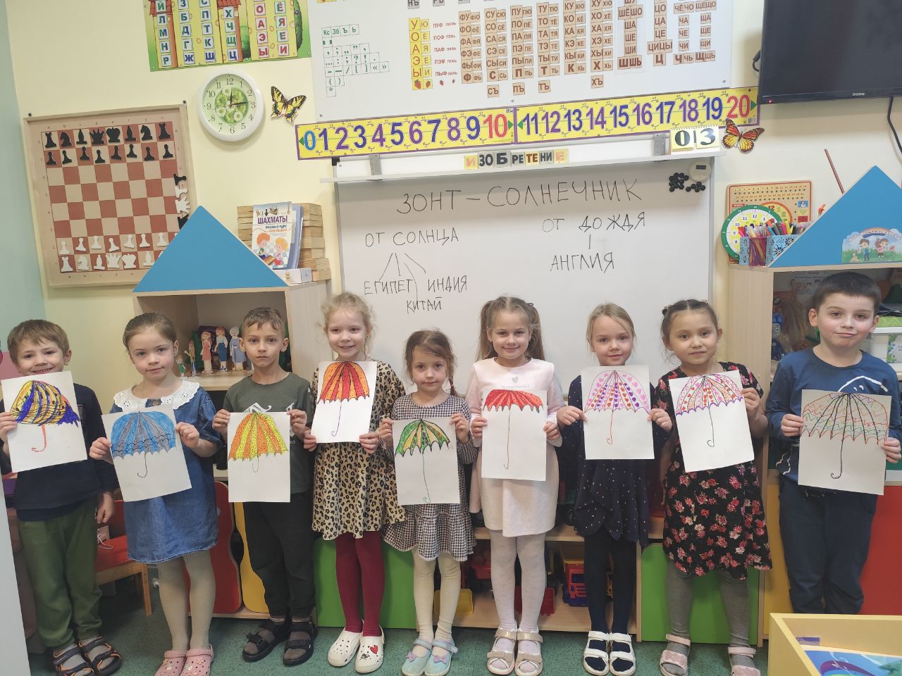 Дети узнали всё об изобретении зонта и изобразили свой неповторимый с помощью фломастеров и карандашей.